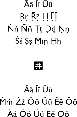 GraecoLatin | GreekCaps | Mosaica | Osmanli | Arabica | Sasana | Nagari | Shittan | Pinyin | I-ching | T'ai-hsüan | Serica